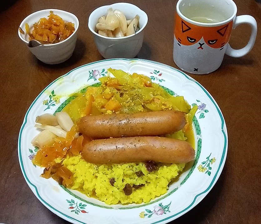 干しブドウ入りのサフランライスにターメリックの効いたカレールーをかけて、さらにたんぱく質補給のために大きなソーセージを2本も載せてくれました。